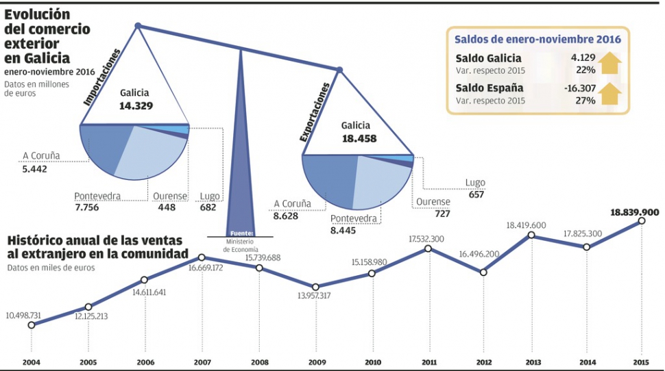 La facturación al extranjero ascendió en noviembre a 2.000 millones, un 23% más y la de A Coruña casi dobló ese promedio - La confección concentra un 30% del comercio.