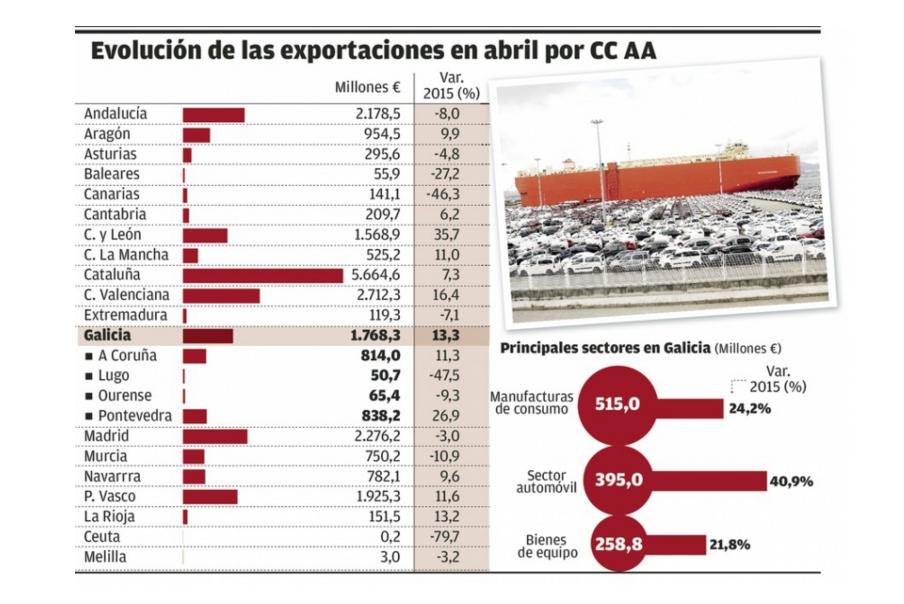 ...El saldo positivo de las manufacturas de consumo es de 1.100 millones, frente a los 1.400 del conjunto de la comunidad - Galicia eleva un 7,5% la exportación en cuatro meses